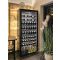 The LED lights reflect on the cabinet inside and on the bottle-handling structures, both in polished steel, enhancing the view of the displayed bottles.